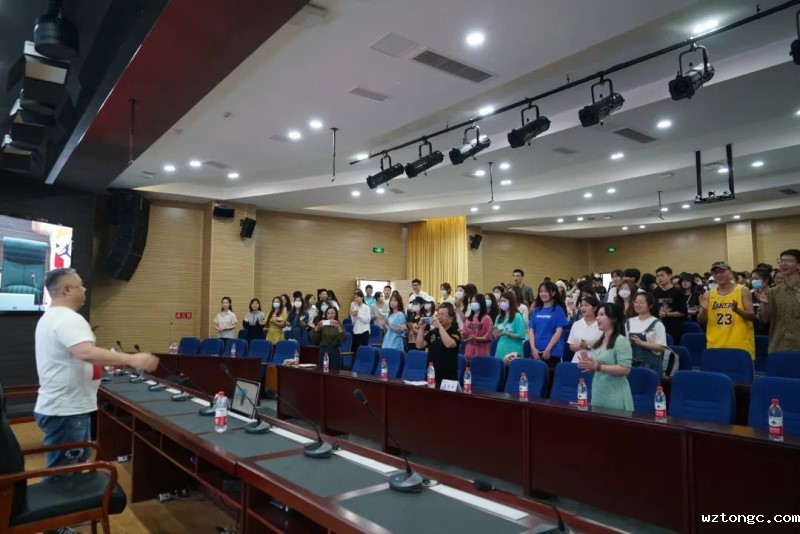讲座最后,魏全斌先生寄语绵师学子“教育的本质是大爱,教育的终极目标是沟通,用我们崇尚的教育改变我们的学生和我们自己”,还与全场师生一起合唱一曲《蓝莲花》。