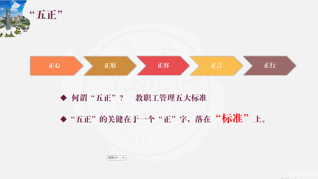 其次,“五正”,用本学的思想去正心、正形、正容、正言、正行。最后,梁副院长宣讲大学教师的师德师风规范要求。