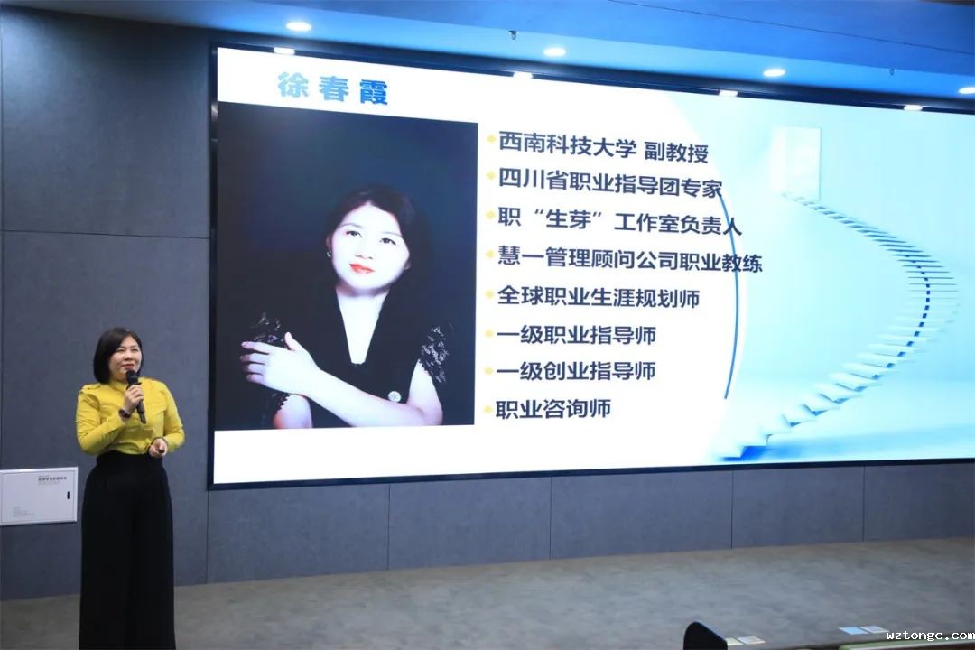 活动现场,西南科技大学徐春霞副教授(四川省互联网+职业指导团专家、四川省“点亮生涯”大学生职业生涯规划大赛决赛评委、职“生芽”工作室负责人 )为绵飞院学子开展了职业生涯规划大讲堂,引导树立正确的择业、就业观念,明确奋斗目标,提升就业能力。