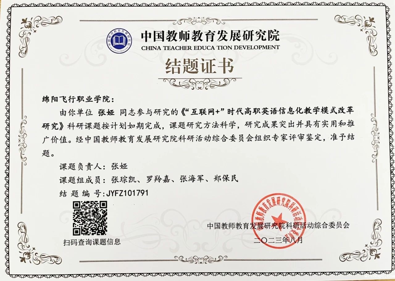 由betway伟德官网张娅老师负责的中国教师教育发展研究院课题《“互联网+”时代高职英语信息化教学模式改革研究》顺利结题。